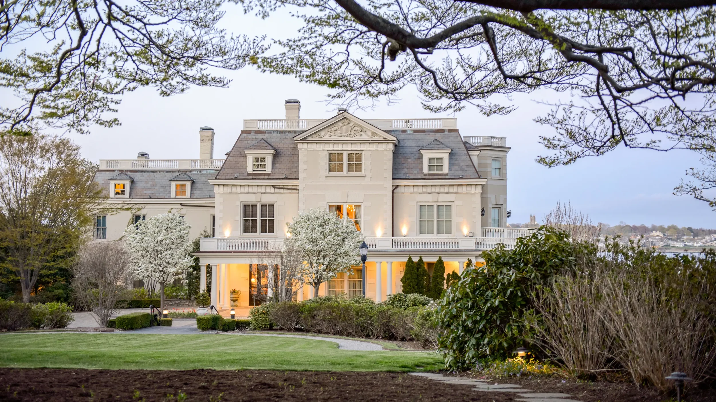 Overlooking the Sakonnet River, Glen Manor House is a French chateau-style estate that feels both refined and deeply romantic. The architecture is beautiful — with arched doorways, carved staircases, and garden views from nearly every room.